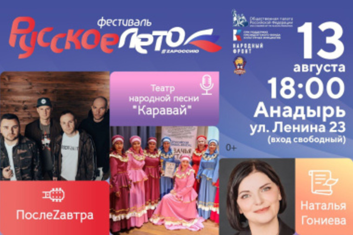13 августа в Анадыре состоится концерт «Русское лето. ZаРоссию» (12+). Хедлайнером программы будет ставропольская группа «ПослеZaвтра». Столица Чукотского автономного округа примет масштабный музыкальный фестиваль следом за Псковом, а в целом маршрут пройдет через 26 городов в шести федеральных округах Российской Федерации. Подробная программа фестиваля опубликована на официальном сайте: русскоелето.рф.