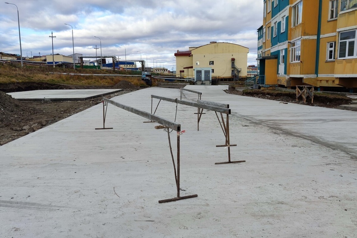 В ближайшее время подрядчик оборудует во дворе тротуары. Работы по оборудованию дворового освещения по ул. Строителей 4-14, детской площадки напротив дома 14 и спортивной площадки напротив дома 4 будут выполнены в следующем году – игровые и спортивные элементы, опоры будут доставлены в Анадырь позже.