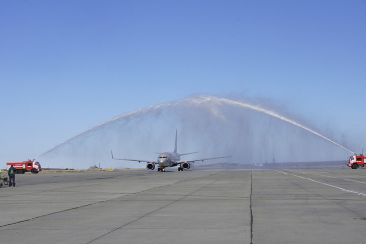 Водяной аркой встретили в главном аэропорту Чукотки первый самолет из Красноярска